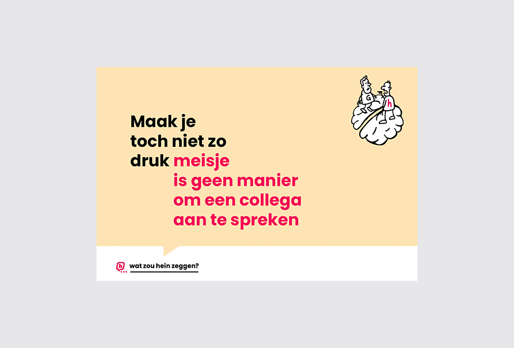 Het verschil met al die cursussen en trainingen is dus: met hein heb je een instrument om mensen indirect aan te spreken. Doordat je het via de derde persoon doet. Je zegt niet meteen: “Dat kun je beter anders doen”. Maar je laat hein dat zeggen. En dan is het veel beter te verteren. Je confronteert elkaar op een ludieke manier. Dan blijft het hangen.
